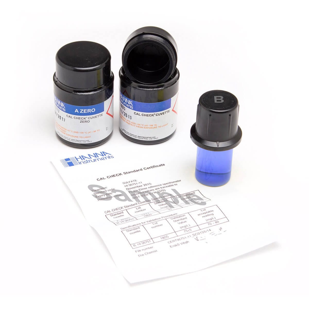 El HI96702-11 es un conjunto de estándares de calibración de alta calidad que permite a los usuarios validar y calibrar el fotómetro portátil para cobre intervalo alto con un intervalo de 0.00 a 5.00 mg/L (ppm). El HI96702-11 incluye una celda sellada “A” para poner en cero el medidor y una celda “B” que se usa para validar o calibrar. La lectura esperada del estándar “B” es de 2.00 ± 0.07 mg/L de cobre a 25 °C. Este conjunto de estándares de calibración se produce en nuestras instalaciones de última tecnología utilizando productos químicos grado reactivo en un ambiente de temperatura controlada.