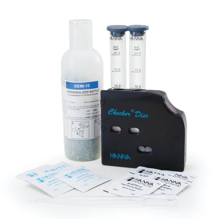 El HI38017 es un kit químico que determina la concentración de cloro libre y total en dos intervalos: 0 a 0.7 mg/L y 0 a 3.5 mg/L. El HI38017 se suministra con todos los reactivos y accesorios necesarios para realizar ambos análisis, incluido el disco Checker® para una determinación precisa. El kit de prueba contiene suficientes reactivos para realizar 200 pruebas.