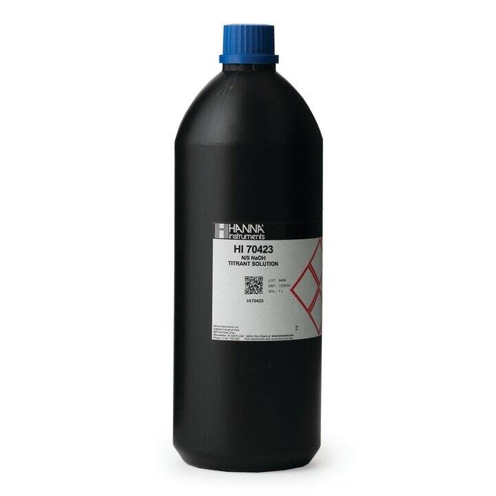 El HI70423 es un titulante de hidróxido de sodio para uso en titulaciones ácido-base estándar. Las soluciones y reactivos de titulación de Hanna tienen el número de lote y la fecha de vencimiento claramente marcados en la etiqueta y son herméticos con un sello a prueba de manipulaciones para garantizar la calidad de la solución.
