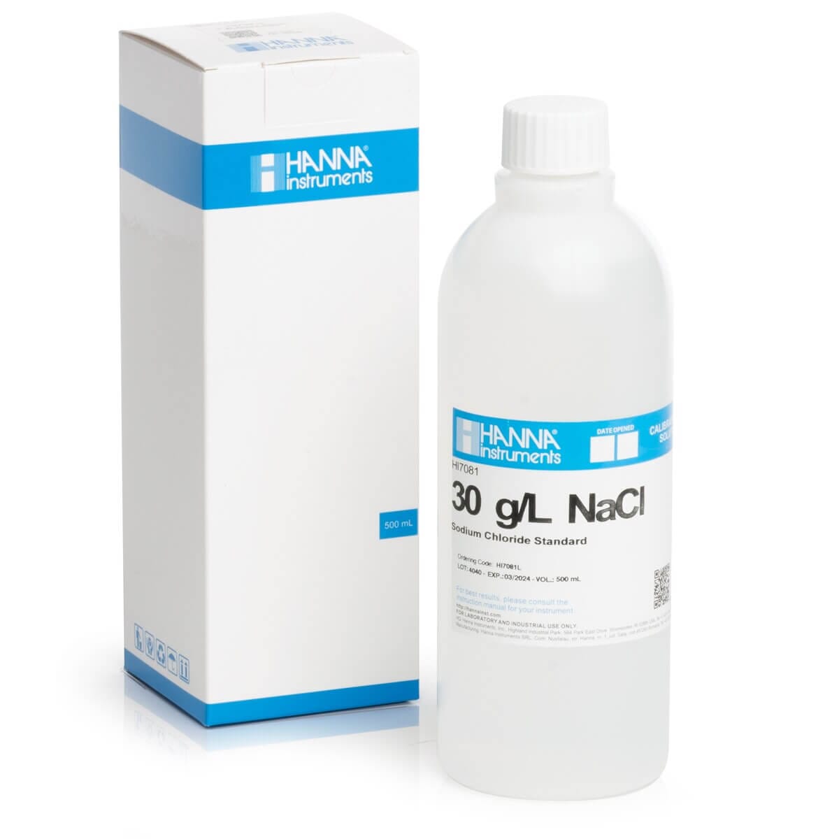 La HI7081L es una solución estándar de cloruro de sodio (NaCl) de 30 g/L de calidad superior, que viene en frasco de 500 mL y que es utilizada para la calibración de medidores de salinidad e ISEs de sodio.